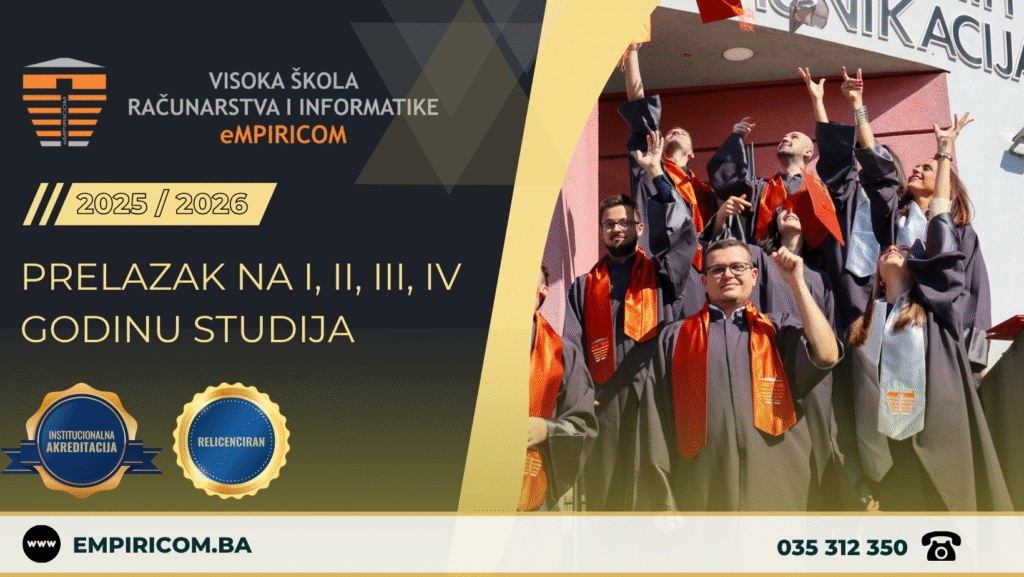 Fakultet Visoka škola računarstva i informatike eMPIRICOM u Tuzli u akademskoj 2025/2026 godini vrši upis studenata koji prelaze sa druge visokoškolske ustanove radi nastavka studija na Visokoj školi eMPIRICOM za sve četiri godine I ciklusa studija na studijskom programu Računarstvo i informatika u trajanju od 3 godine (180 ECTS) ili 4 godine (240 ECTS), sa smjerovima: