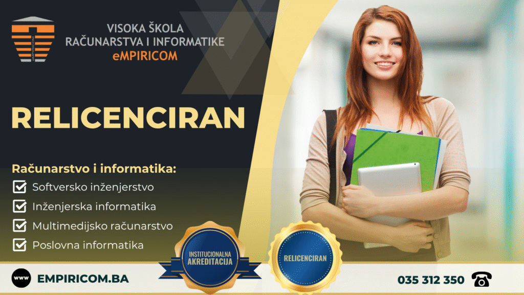 Visokoškolska ustanova „Visoka škola računarstva i informatike eMPIRICOM“ u Tuzli sa zadovoljstvom obavještava javnost da joj je Ministarstvo obrazovanja i nauke Tuzlanskog kantona, nakon detaljnog procesa evaluacije, obnovili licencu za studijski program Računarstvo i informatika na period od 5 godina, što potvrđuje visoke standarde kvaliteta našeg obrazovnog procesa i ispunjavanje svih kriterija koje postavlja nadležno ministarstvo.